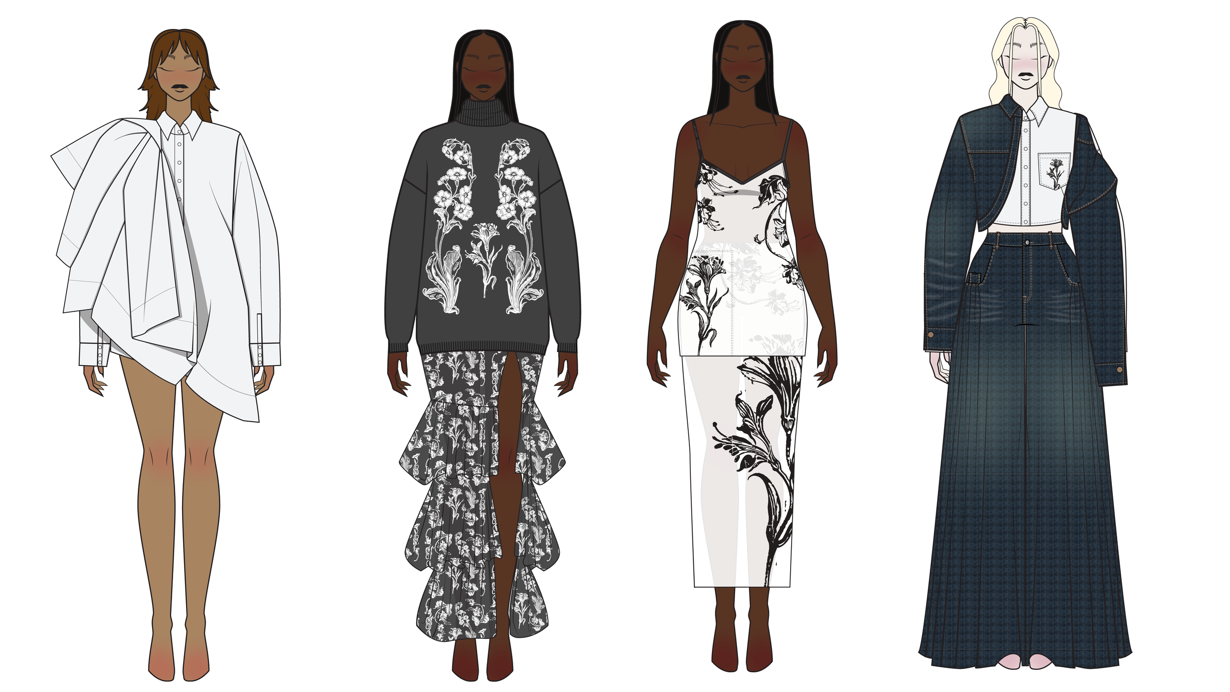 A restrained palette of ivory, black, ash, and washed denim keeps the focus on print and texture. Lightweight fabrics and soft volumes create ease and movement, with layering and transparency adding depth. The result is a quiet, modern femininity that feels intuitive, atmospheric, and alive.