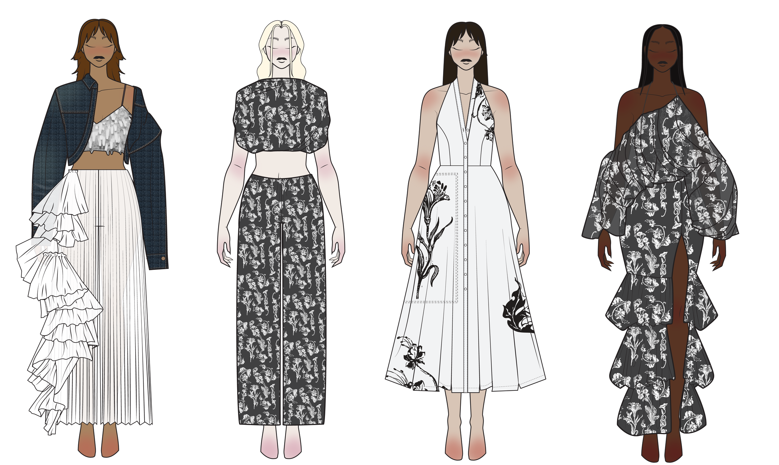 This collection is rooted in ink-based florals, where prints feel hand-drawn and organic rather than ornamental. Inspired by botanical sketches, and swirly, twisting plant forms, the motifs move across the body like ink bleeding into paper—fluid, imperfect, and expressive.