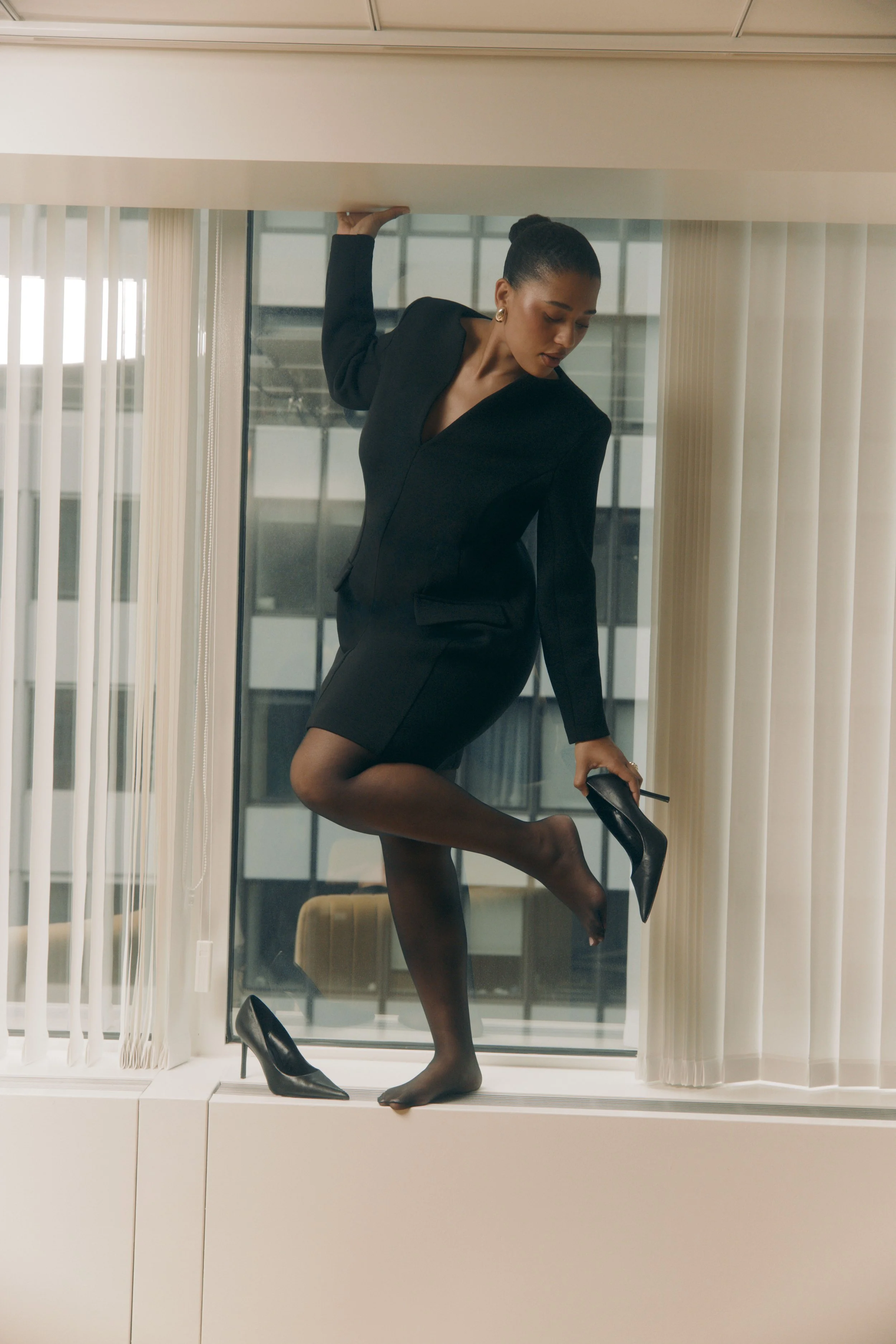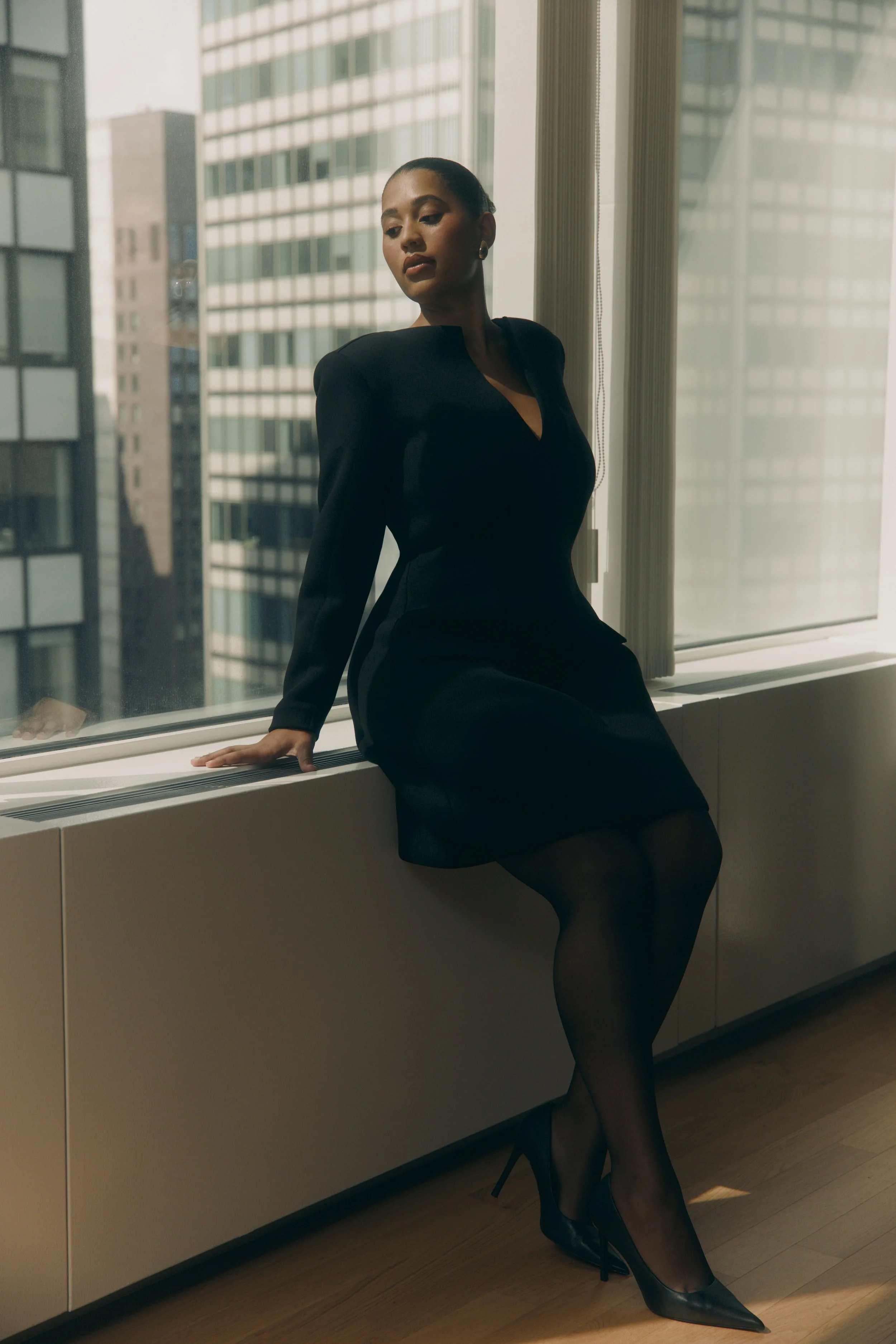 BONDED SCUBA DRESS WITH DEEP V - FALL 2025