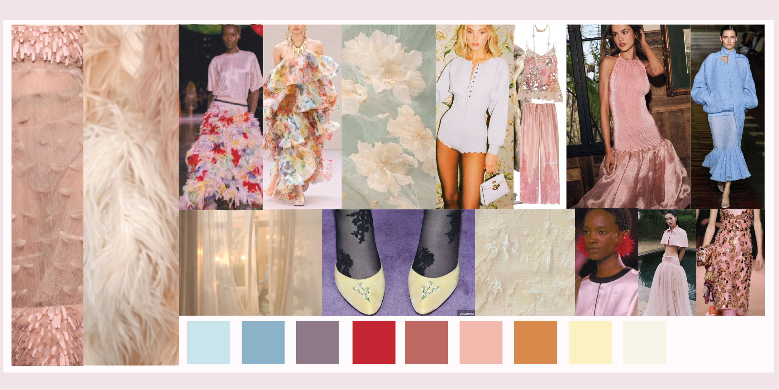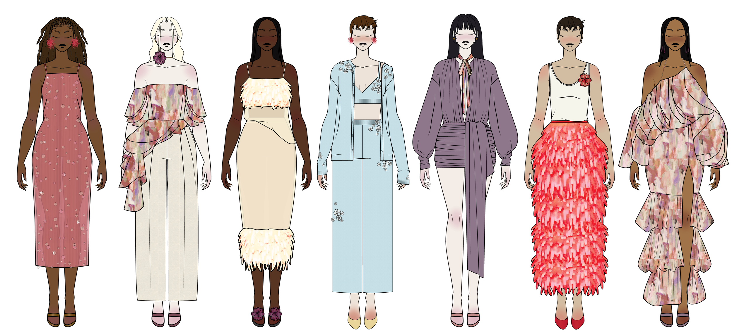 There is a quiet harmony to the scene. Fabrics drift and catch the light as people pass one another, textures revealing themselves only up close: subtle sheen, delicate surface detail, the suggestion of florals rendered more by feeling than form. Nothing feels heavy or rigid. Silhouettes breathe, sleeves float, hems skim the ground.